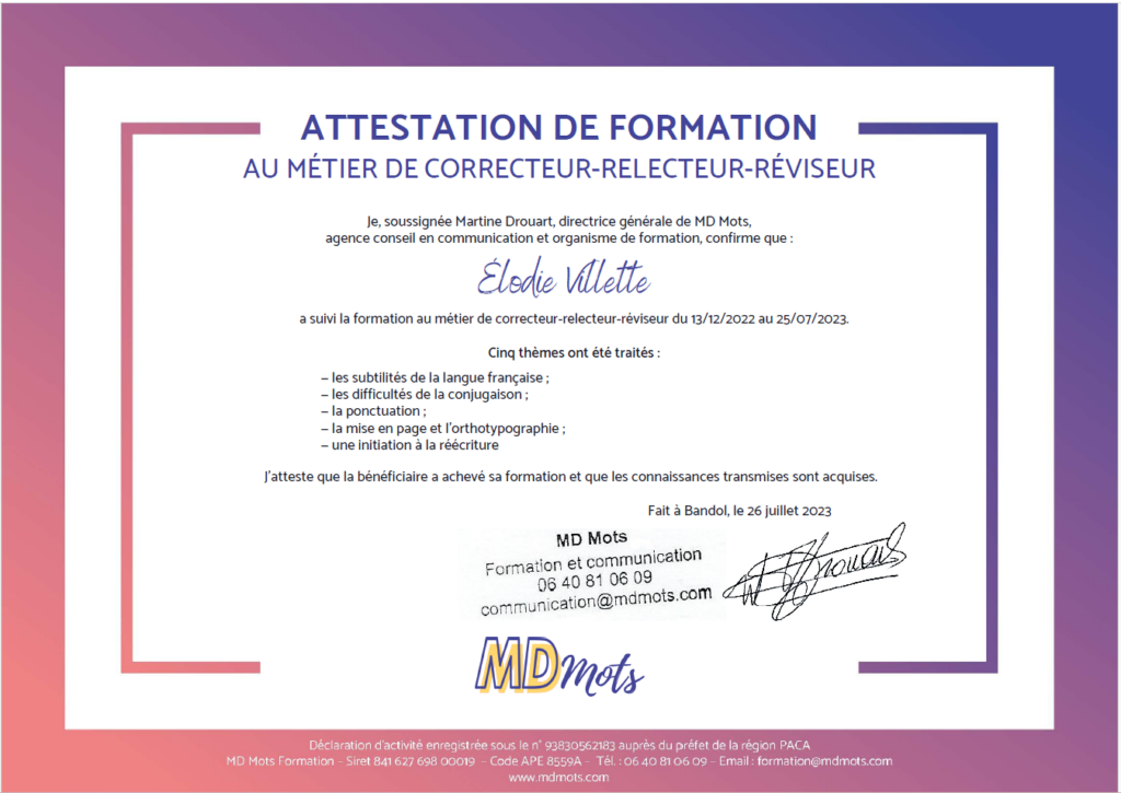 Je me présente : Élodie, votre experte en correction et relecture. Je suis une passionnée de la langue française et de la littérature. J’ai obtenu mon certificat de correctrice-relectrice en 2023 délivré par l’excellente formation MD Mots.